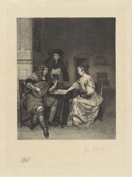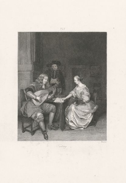 Reinier Vinkeles created this print depicting a man with bread visiting a poor mother and children, with etching. Notice how the composition divides the scene into distinct zones of light and shadow, effectively isolating the figures. The stark contrast in light emphasizes the emotional weight of the interaction. The man with bread is positioned near the doorway, a liminal space that highlights his role as an intermediary between the outside world and the interior of poverty. The lines of the room converge, creating a sense of depth that draws our eye to the figures. Vinkeles masterfully employs the semiotic potential of space and light to comment on social inequalities. The composition challenges conventional notions of domestic bliss, suggesting a more complex relationship between charity, need, and social visibility. This print acts as a site for ongoing interpretation of social and economic disparities.
