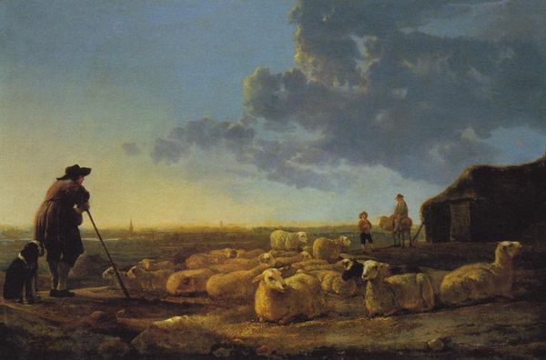 Curator: Ivan Konstantinovich Aivazovsky painted this idyllic scene, entitled "Shepherds with a Flock of Sheep," in 1872, using oil paint to capture a peaceful landscape. Editor: The light is just exquisite, isn't it? Like a hazy memory, or maybe a half-forgotten dream. It evokes such a specific sense of warmth and stillness. Curator: Well, think about the role of sheep in 19th century Russian society. Wool production, of course, was critical for textiles, a burgeoning industry even then. So scenes like this weren't simply picturesque; they represented labor, the foundation of the rural economy. Editor: I can see that, definitely. But even knowing that, I'm drawn more to the way the setting sun seems to bleed across the sky, this almost… melodramatic glow. Aivazovsky always gets me with those big skies! It makes the tiny figures of the shepherds seem almost insignificant against the grandness of nature, the eternal return of sheep under sunset. Curator: Yet the brushstrokes also suggest a rapid application of paint, likely indicating that he focused intently on achieving immediacy with this scene, which can reflect increasing market pressures within the art world in that time. One man mass producing romantic imagery! Editor: A poet of light churning them out… I like that image almost as much as the painting itself! Makes me consider the real grit of Romanticism. I almost pity those sheep. The light and brushstrokes hide a certain sadness to all that commerce. Curator: Perhaps, perhaps not. I wonder though, considering his other seascapes, whether his studio practices involved techniques adapted specifically for rendering large skies with water effects as an inspiration. It suggests a certain production-oriented perspective to Aivazovsky’s methods. Editor: Right, this sort of beautiful painting then represents both something real, an account of Russian economic production, but also a bit of dream for sale, romantic pastoral image packaged to sell at market. The material reality, always intertwined, don't you think? Well, either way, I find it moving and kind of complex for its initial peaceful appearance! Curator: Absolutely. Seeing how artistic expression blends with broader social structures provides insight. Editor: A sunset reflecting our interior, as much as illuminating economic realities.