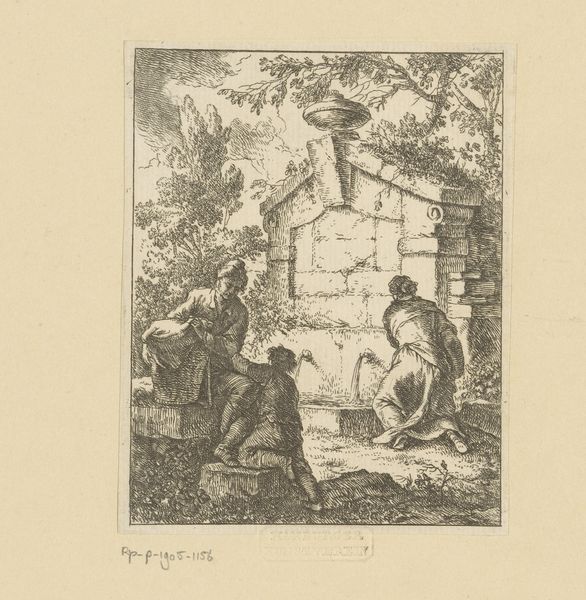 Editor: This is "Three Shepherds by an Old Bridge," an etching by Franz de Paula Ferg, created sometime between 1699 and 1740. It’s a detailed scene, but the old engraving style gives it a rustic, almost rough-hewn feel. What stands out to you when you look at this piece? Curator: I notice how the process of etching, the labor involved in creating the image through a series of controlled corrosions, highlights the tension between art and craft. Consider the socioeconomic context: who was commissioning prints like these, and what was their value in relation to other forms of art production at the time? Editor: So you're saying that it's not just about the pretty landscape scene, but the *making* of it? How the work and material circumstances are important? Curator: Precisely! The very act of producing and distributing this print, as opposed to a unique painting, implies a different form of engagement with the art market, influencing its reception and purpose within society. Think of the consumption habits it reflects; it shows us who had access to art. Were prints like these aspirational objects for a rising middle class? Editor: That's a different way of considering art, not just pretty scenes, but products of a system of labour and economic exchange. Curator: And think about the social standing of those depicted in the landscape. The materiality and methods shape how we should also look at how labor is being performed. Editor: It really changes my perspective, seeing it less as a pastoral scene and more as a tiny window into the means of artistic production of the 18th Century. Thanks! Curator: Indeed, understanding the material conditions encourages us to see art as embedded in a web of production, labor, and social context.