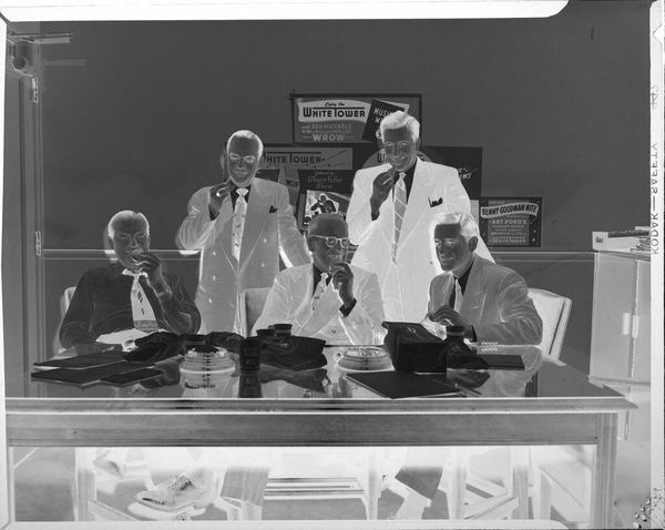Curator: This photograph, attributed to Peter James Studio, captures a meeting of advertising executives on the "White Tower" account. Editor: The image, though small, exudes a strange power dynamic. It's almost spectral, with these figures hovering around the table. The negative image only amplifies the feeling. Curator: It is fascinating how the White Tower logos behind the men are iconic symbols of fast food. The men gathered around the table have an important cultural and psychological power. Editor: Absolutely. The image is more complex than its face value. The almost ethereal quality, the corporate logos hovering, all point to the intangible yet persuasive power of advertising. Curator: Indeed. It's a compact image, yet it feels like it has the power of persuasion. Editor: The image invites us to ponder the relationship between corporate imagery and human interaction.
