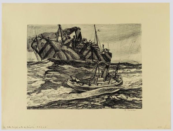 Editor: So, this is "The Prow" by Gifford Beal. It looks like an etching, and I'm struck by the contrast between the massive ship and the playful dolphins. What stories do you think this image might be telling? Curator: I see a powerful commentary on man versus nature, and the often violent intersection of maritime trade with the natural world. Consider the history of whaling or even the transatlantic slave trade. How does the ship's imposing presence impact your interpretation of the dolphins' playfulness? Editor: That’s a darker reading than I initially had, but it makes me think about power dynamics. I was too focused on the surface. Curator: Exactly. By considering historical context, we can see how this seemingly simple scene engages with complex issues of exploitation and environmental impact. It's a great reminder of how art can subtly reflect the realities of its time. Editor: I will keep that in mind next time. Thank you!