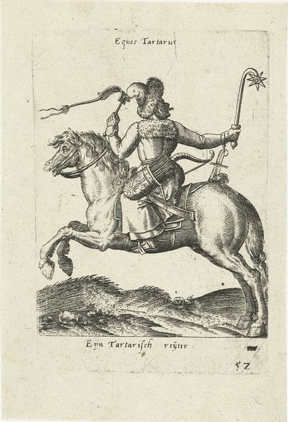 Editor: This is Abraham de Bruyn's "Lithuanian Rider," an engraving from 1577. I'm struck by the details of his dress and how it presents an image of foreign opulence; however, the landscape feels unrefined, like a pen sketch. What does this print say to you? Curator: This image is steeped in the complexities of cultural representation and power. It's important to recognize that images of the “other” – those from different cultures – were often filtered through the lens of the dominant culture, perpetuating stereotypes and power dynamics. What do you notice about the rider's posture? Is there an element of spectacle involved? Editor: I see how his dress is so detailed but you’re right, he's more posed than actively riding. He's presented almost as an exhibit, but what would that signify? Curator: Consider the history of Lithuania during this period and who would commission this kind of portrait. These early prints functioned almost as ethnographic documents. Often, such depictions emphasized the "exotic" or "foreign" to reinforce a sense of Western European superiority or to fuel political agendas. We have to question whose story is really being told here and for what purpose. The context in which an artwork is viewed inevitably affects its reading. What kind of implications are suggested? Editor: So, the seemingly simple portrait speaks volumes about intercultural relations and maybe the use of visual culture as a tool to distinguish identities… Thank you, I see much more complexity now! Curator: Precisely! Art gives us a window into both the past and present if we’re willing to look critically at who is doing the looking. It also enables an active conversation around identity and political discourse, and how to engage with social structures today.