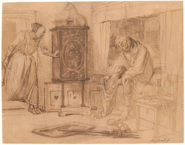 Editor: This drawing, "Saint Jerome in his Study," dates from 1560 to 1580 and is by an anonymous artist. It's done in ink on paper. The overwhelming sense for me is one of quiet contemplation, almost monastic. What do you see in this piece? Curator: The prevalence of Saint Jerome imagery during the Renaissance signals more than just religious devotion. Jerome, the scholar who translated the Bible into Latin, became a powerful symbol of humanist ideals: intellectual pursuit, the importance of original texts, and the reconciliation of classical learning with Christian faith. Editor: I see, so the setting contributes to his persona. Curator: Indeed. Look at the composition – the skull on his desk, the lion at his feet. What feelings or ideas do they evoke? Consider how they were understood in the Renaissance. Editor: The skull represents mortality, I suppose. The lion, I would assume, represents the story of him removing a thorn from its paw. The desk is adorned with what seems like an opened tome. Is he shown more as a scholar than a saint in this one? Curator: The placement of the lion at his feet could also speak to a triumph of intellect and faith over primal instinct. Ask yourself, is this drawing purely biographical, or is it using the figure of Jerome to communicate broader ideas about the value of knowledge, faith, and our place in the world? Editor: It’s fascinating how many layers of meaning are embedded in what appears to be a simple depiction. I'll never look at another Saint Jerome in the same way. Curator: Understanding these layers reveals how art functions as a storehouse of cultural memory, constantly reinterpreted through the lens of changing values and beliefs.