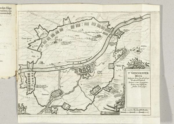 Curator: Here we have "Kaart met de Franse legerkampen bij het ontzet van Arras (linkerplaat)," created by Nicolas Cochin, circa 1654, using engraving and etching techniques. The Rijksmuseum holds this print. Editor: The immediate impression is a feeling of precision and meticulousness. The monochromatic palette and the sheer density of the linework create this fascinating sense of order imposed upon… something. A controlled visualization of conflict perhaps? Curator: That control comes from the mapmaker’s imperative. Maps of this era, particularly those depicting military campaigns, served a symbolic purpose, beyond mere practicality. Consider the line work itself: each stroke an act of defining territory and projecting power. Note, too, the cartouche; so decorative for a document ostensibly about military operations. Editor: Absolutely, the decorative elements framing the informative data immediately speak to a more expansive purpose beyond sheer utility. But I wonder about the means of production: the labor invested in engraving and etching such intricate details, replicating what must have been quite a large-scale operation onto a comparatively small, consumable print. It speaks to the beginnings of accessible media portraying military propaganda. Curator: Precisely. These images were instrumental in shaping public perception. Look at how Cochin employs standardized symbols for each military unit. The repeated symbols give a sense of formidable order. They transform individuals and chaos of battle into a clear, organized message. Each small form contributing to the perception of an unwavering military might. Editor: It's that tension between representation and reality that intrigues me. The etching gives us this visual shorthand. While elegant and informative, it certainly sanitizes and codifies the chaotic, destructive reality of war, into a commodity fit for purchase. One to be framed perhaps, displayed to solidify its message through repeated viewing. Curator: That is its enduring quality, this carefully constructed depiction of military campaigns. Maps like this allowed individuals far removed from the battlefield to visualize and internalize France’s military prowess and the divine right of its kings. Editor: A truly powerful, visually engaging piece with social repercussions that were woven into the labor of the artistic act itself, as well as its cultural purpose as propaganda. Curator: Indeed. An early example of carefully crafted imagery for widespread consumption with political and psychological messaging intricately etched within.