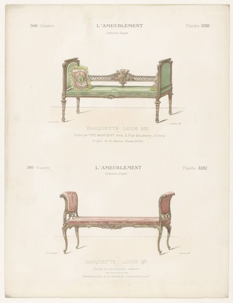 Léon Laroche made this print titled 'Two Chairs', which depicts furniture designs, as part of a collection showcasing single items of furniture. Considered within the context of design history, these chairs represent more than mere objects; they are artifacts imbued with cultural significance. The styles reference 'Marquise Renaissance' and 'Marquise Louis XVI', evoking a connection to an elite class and era. By reviving historical styles, Laroche reflects a desire to reconnect with a perceived golden age, even as industrialization and social change challenged traditional hierarchies. What feelings do these objects evoke for you? Do you imagine someone sitting in them? What does their presence tell you about them? These designs allow us to meditate on the relationship between design, identity, and power, asking questions about how material culture shapes and reflects societal values.