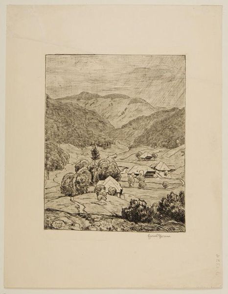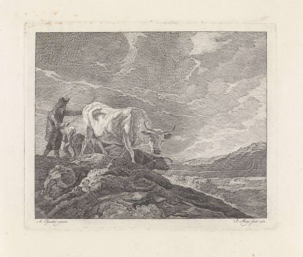 Editor: So this is Christian Wilhelm Ernst Dietrich’s “Oxen Going to Drink.” It seems like an etching, undated. It's… pastoral, but a little melancholy. What do you see in it? Curator: It’s tempting to view this scene as idyllic, but let's consider the socio-economic context. Dietrich, a court painter, romanticizes rural life, yet this image obscures the harsh realities of agricultural labor and animal exploitation. How might our contemporary awareness of animal rights influence our interpretation? Editor: I hadn’t thought of it that way. It does change the mood significantly. Curator: Exactly. By questioning idealized representations, we challenge power dynamics embedded within art history. Editor: That's a powerful perspective. Thanks! Curator: My pleasure. Looking critically allows us to create more equitable and informed narratives.