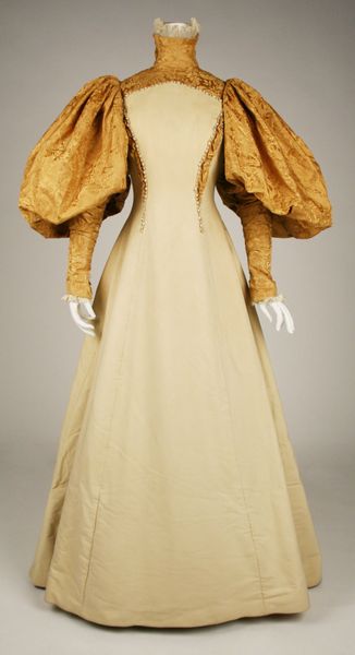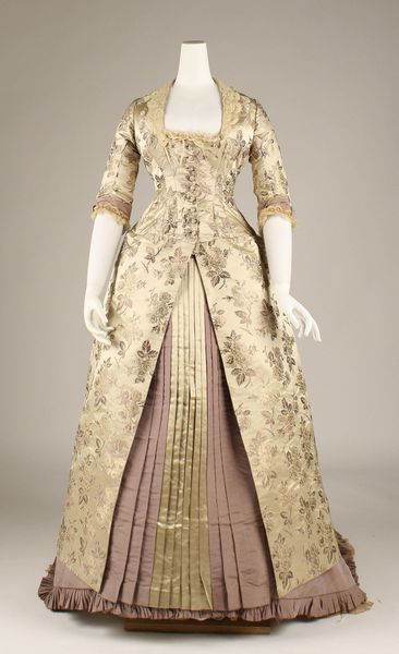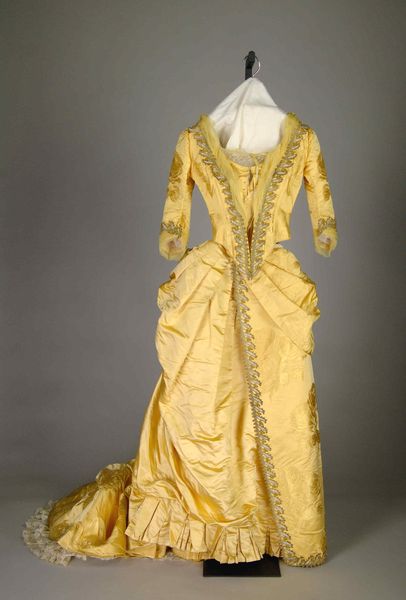 Curator: Ah, yes, here we have a dress from the late 1880s, held in the collection of the Metropolitan Museum of Art. It's fashioned from silk and other textiles. It immediately calls to mind those sumptuous historical paintings depicting ladies of the court. Editor: What a faded beauty! It feels haunted, somehow. That antique gold is very melancholic. And the skirt’s almost like basket weave. Curator: The colors certainly speak of time's passage. However, gold shades also traditionally signify wealth, power, even divine grace. In terms of fashion, the bustle silhouette was paramount then; it reshaped the body into an S-curve, exaggerating the hips and bust. Editor: It is so sculptural, it makes you wonder about the body inside it, restricted and reshaped. I bet this was somebody’s special dress! The intricate trim looks quite carefully and tightly sewn into the garment. But if colors can fade with time, it suggests, can the body's beauty fade with time too, when wearing this garment? It feels sad to have time pass at all. Curator: These garments also operated as status symbols. The embellishments denoted social standing, refinement. Embroidery, lace, the sheer volume of fabric - each choice communicates a message about the wearer’s place in society, as part of a collective. Editor: Absolutely, yes! I like how you bring in that theme. Now that you mention collective experience... if the details had disappeared or faded more it would signify even greater anonymity. In which case, any story about such attire might just remain entirely unreadable! And maybe all that would remain about the garment would be its general silhouette! Curator: Precisely! So, next time you're trying on some vintage clothes, consider that each thread holds a history, a connection to another era, to human experiences woven together. Editor: And now, seeing this lovely but slightly morbid historical artwork… makes me feel like wearing whatever clothing fits nicely—to express what you are without time restrictions! Thank you!