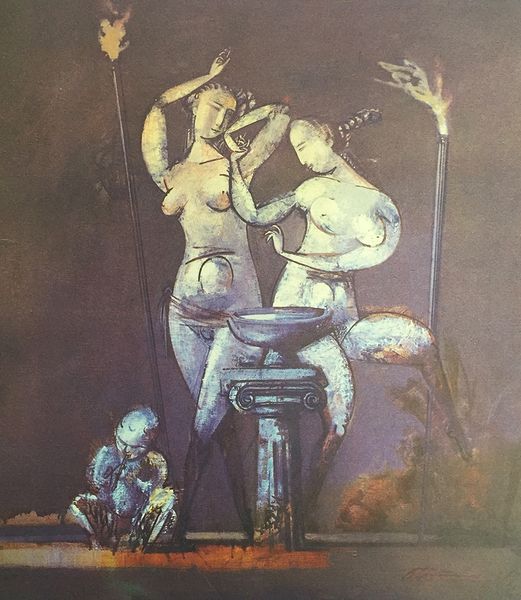 Vasiliy Ryabchenko's "Temptation Method" is a large-scale painting with figures rendered in a way that feels both classical and totally off-kilter. There’s something so satisfying about the way Ryabchenko builds up this scene using luscious, juicy paint strokes, sort of like stacking thoughts one on top of the other. Check out the fleshy tones around the figures; they almost seem to be emerging from the shadows, which is cool, right? I can almost feel the surfaces because of the way he works the paint. The little Cupid playing the flute is especially compelling. That slash of red for the flute is like a visual dare, pulling your eye right into the heart of the painting. The muted purple that the image is set against reminds me of some of Philip Guston’s later work, in the sense that both artists use colour to create the atmosphere of a dream. It reminds us that art is an ongoing conversation.