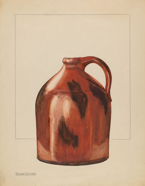 Bessie Forman created this watercolor painting of a jug sometime in the 20th century. The jug, a vessel meant to contain and preserve, has existed since antiquity. Look at its form: a wide, stable base tapering to a narrower neck, crowned with a handle. Its shape echoes the ancient amphorae of Greece and Rome, vessels that carried wine, oil, and grains across vast empires. But here, the utilitarian aspect of the jug takes center stage. Unlike the amphorae, this jug loses any decorative elements to become a simple receptacle. We see the endurance of basic human needs distilled into this single object. Its earthy tones and unadorned surface evoke a sense of timelessness, quietly reminding us of our shared history. The jug becomes more than an object, it is a silent carrier of our collective past.