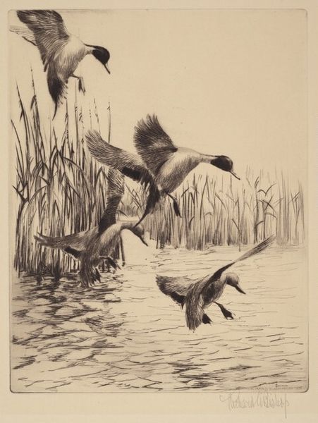 Curator: This intimate print greets us with the simple message: “Merry Christmas from Helen and Dick Bishop." It appears to be an etching, maybe an engraving, created by Richard Evett Bishop. What do you make of this Christmas greeting? Editor: It strikes me as starkly beautiful, in a somber kind of way. The muted palette focuses all attention on the precisely rendered forms of those birds, but it feels cold and lonely. Curator: The image centres on a skein of ducks cutting across a misty landscape. It’s an example of realism and perfectly in keeping with Bishop's other celebrated works of wildlife art, even the medium speaks to its cultural memory. Printmaking was a deeply democratic medium for centuries, conveying messages directly into people’s homes, particularly as affordable illustrations. Editor: You’re right. I was too hasty. There’s also an understated elegance in that composition – a simple horizontal landscape providing the foundation for the dynamic upward sweep of the waterfowl. The scene is rendered with delicate skill, while the etched line mimics a brisk chill in the air, a northern climate and wintering species perhaps. The lack of sentimentality makes it rather honest, I'd say. This wasn't a commercial product, so it really puts one in touch with a specific aesthetic tied to the couple’s identities and values. Curator: Certainly. The symbol of waterfowl is multilayered across cultures and time. Migration is one obvious symbolic pathway, but consider that, to some, the image of ducks implies the soul’s journey, while the precision Bishop employs highlights humankind's appreciation for the natural world, seeking perhaps to enshrine it as cultural knowledge. There’s almost an ecological sentiment here. Editor: Interesting thought, particularly when presented as a token of affection during a seasonal celebration. Its directness challenges what one expects from holiday greetings. It resists manufactured emotions. It's a message, from them to their circle, perhaps suggesting where their values lie. That stark landscape says so much. Curator: In retrospect, there is a poignancy, seeing this scene – perhaps one familiar to them personally – immortalized as a gesture of annual renewal. It becomes a powerful reminder of what endures: the natural world. Editor: I see it now. It carries so much with so little – more affecting than any elaborate display.