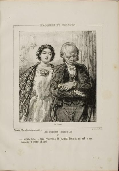 Curator: Paul Gavarni, a French artist born in the early 19th century, is the creator of this image entitled "What's with you, Mimie? The damned colic again?" Editor: It looks like a tense scene. The figures are close, yet emotionally distant, a sort of domestic drama captured in monochrome. Curator: Indeed. Gavarni's focus on line and form skillfully conveys the palpable sense of unease. Note how the cross-hatching adds depth to the figures, particularly Mimie herself. Editor: Given the likely printing methods of the time, I am curious about the role of the printmaker and how their labor influenced the final product we see now. Curator: A valid point. However, I'm more interested in the formal contrast between the darker tones of the man's coat and Mimie's delicate shawl. Editor: All the same, recognizing the social circumstances in which these prints circulated can help one to appreciate Gavarni's art in a new light. Curator: Yes, and by analyzing the lines and values, we can appreciate the emotional tension Gavarni masterfully depicted. Editor: And understanding the materials and labor involved reminds us of the many hands involved in bringing this image to life.
