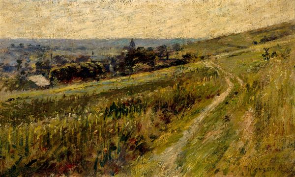 Curator: This is Gustave Caillebotte's "The Plain at Gennevilliers, Group of Poplars," painted in 1883. It's an oil-on-canvas work currently held in a private collection. Editor: It feels like a world seen through gauze. Muted colours, almost a silver-grey dominating, and that diagonal path really pulls my eye into the distance. There's a sense of quiet labor in it too. Curator: Absolutely. Caillebotte painted this during a period of immense change in the Gennevilliers region, as industrialization and urbanization began to encroach on agricultural land. The peasants laboring on the field are, in my interpretation, symbols of tradition confronted with social reformation and new class emergences. Editor: I see what you mean. The figures are quite small in relation to the vastness of the landscape, as if insignificant to the progress. I wonder, were they even the artist's primary interest, or did he include them simply to add realism? How were rural populations affected by this progress? Curator: I think the tension is deliberate. Caillebotte, as a flâneur of modern life, was very attuned to those societal shifts. He portrays not a romantic idyll, but the effects of labor, and perhaps subtly highlights the displacement and pressures faced by this group that capitalism affected. Notice that his focus is more the field workers and not those new modern industries that are appearing far on the horizon line. Editor: And yet, it is an incredibly beautiful scene, not overtly critical. I find myself more drawn to the technique here – the application of paint, the shimmering effect that conjures wind moving through tall grass. Caillebotte manages to avoid idealizing labour while celebrating its relationship with nature. Curator: The location and that technique are both critical to understand. Caillebotte's unique artistic practice, the location, and of course, the moment. The fact that industrialization of labor happened and still happens affects the art sphere from a global perspective. The history and current situation of countries must be understood to understand Caillebotte. Editor: Indeed, placing "The Plain at Gennevilliers" in its context allows us to appreciate it on multiple levels – as a painting of a beautiful place, a witness to a historical transformation, and also a critical document reflecting Caillebotte's world view. Curator: For me, that interdisciplinary analysis that combines so much in this one oil canvas highlights intersectional relationships about history, sociology and cultural elements. Editor: A wonderful encapsulation of an important painting that makes me want to observe from Caillebotte’s viewpoint of societal transformations, and it certainly leaves you much to think about.