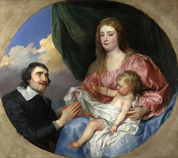 Curator: Here we see William Dobson's "Portrait of Richard Streatfeild Family," created around 1645 using oil paint. Editor: Immediately, what strikes me is how intensely somber it feels. Even with the children present, there's a weight, a gravity to it all. And the skulls... are those really necessary? Curator: They do rather jump out, don’t they? Those skulls are certainly a striking vanitas motif. Dobson, painting during the English Civil War, understood the precarity of life and the transience of worldly possessions. That influenced not only the subject matter but also the very creation and reception of this oil on canvas artwork. Editor: Yes, I can almost smell the canvas and the pigment. Knowing it was made during such turbulent times adds layers. Makes you wonder what life was like for the artist mixing the paint and the family posing amidst so much chaos. Curator: Exactly. The black garments of the adults and even some of the childrens clothes would've required an immense amount of labour in procuring and preparing materials, then actually producing such luxurious items. Also note, the seemingly hurried execution. You see how thinly the pigments are applied which suggests to me a degree of speed of production compared to other paintings of the period. This probably can be traced to the pressures surrounding the civil war. Editor: The children... they're so serious for being kids in a painting! You know what's really peculiar, though? The child is directing us... pointing almost accusatory... very bizarre! Curator: Interesting reading! Consider Dobson's situation as an artist patronized by the royal court, painting in Oxford, cut off from London, it all adds to a complex web of materiality and circumstance influencing what we see. It is an exercise in survival not in frivolous enjoyment as we might be lead to believe if were seeing portraits of subjects from pre-civil war times. Editor: Well, all in all, despite the slightly unsettling aspects, I can definitely see how this captures a specific and fraught moment in history, the making, as much as the subjects and their serious demeanour. A real reflection on our inevitable fate! Curator: Indeed, the circumstances surrounding this portrait really foreground the human endeavour both of those depicted and its painter. A poignant consideration.