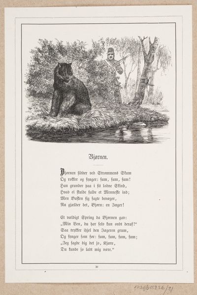 Curator: "De Wolf en de Hond," or "The Wolf and the Dog," made between 1876 and 1890 by Gustave Fraipont. It’s a watercolor and drawing that brings to life this almost fable-like encounter between these two creatures. Editor: My first impression? There’s a lovely melancholy woven in, almost like they both know how this encounter should end. And this page-like layout reminds me of opening an old fairytale. Curator: It does have that storytelling element, doesn’t it? Fraipont sets the scene—a classic landscape backdrop infused with elements of Romanticism. If you consider the timeframe it certainly falls right in line with art being used for instruction and moral tales. Think about the popularization of illustration around the same time for instance. Editor: Yes, and isn’t it interesting to note how the setting almost mirrors their inner states? The sturdy dog with the verdant flora around him juxtaposed against the scrawny wolf walking into the light on the arid road...It practically spells out "domesticated comfort versus wild uncertainty.” You get that too, don't you? Curator: Absolutely. There’s definitely that feeling that the wolf symbolizes hardship while the dog with his jaunty collar has security, duty. And I am taken with the little vignette set higher up; almost an omen looming over them both. Editor: You mean the two men, the hunters, who almost seem peripheral? Do you think Fraipont is using them to amplify the vulnerability, and make the scene less overtly a moral one and more existentially complex? Curator: Possibly so, making their situation a matter of their natures rather than imposed rules. Fraipont has chosen to invite complexity into an illustration—an idea of character as destiny perhaps? Editor: So, less about societal constraints and more about internal wiring…It certainly nudges me towards seeing both as a reflection on what drives decisions and where true freedom lies. Curator: I think you hit on something crucial. It really invites you to ponder where you stand in the landscape, you know? What defines contentment for each of us. Editor: Well, next time I am envying my neighbor's metaphorical pasture, I will come back to this wolf and dog…Maybe then, I’ll find some ease with where I’m trotting!