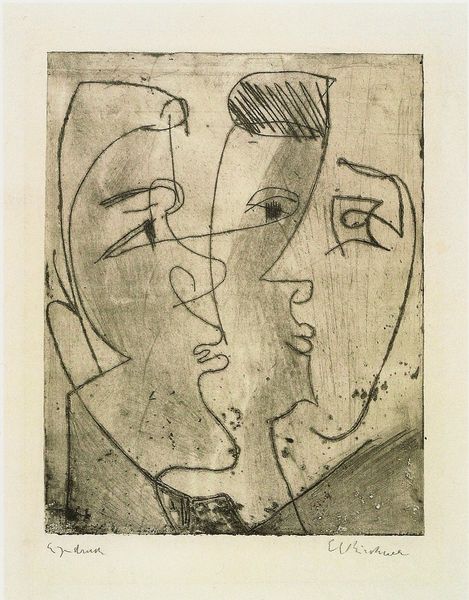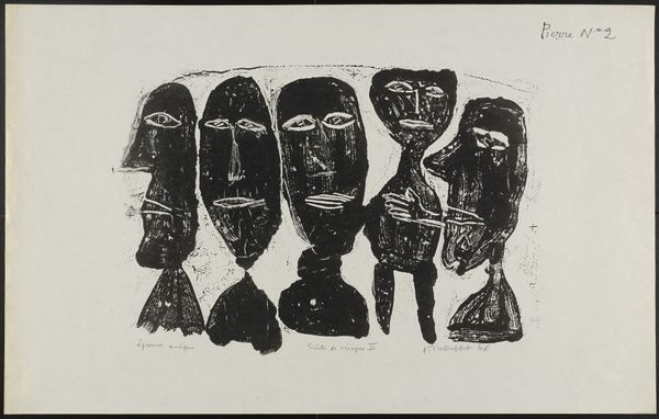 Curator: Upon initial viewing, this mixed media work titled "Colloque II" from 1946 strikes me as deeply unsettling. The stark charcoal against a pale background… It evokes a primal fear. Editor: Well, yes, there is something deeply stark about its visual language. The drawing by Jean Dubuffet reminds us of art brut and it challenges established aesthetics in a society undergoing profound societal shifts. The work invites consideration around outsider perspectives and marginalization. Curator: The faces – or what seem to be faces – are like masks, almost ritualistic in their blankness. Look how the shared darkness between them could suggest a common thought, or maybe opposing internal monologues, endlessly looping. Do you see an echo of older iconography here, the mirroring of Janus for instance? Editor: Absolutely, these are images of dueling narratives – Dubuffet's choice to show visages but strip them bare creates an emptiness, leaving space for projections about collaboration in a postwar world and also perhaps to question what collective action might entail in that context. What expectations should we bring? The medium adds to this. Curator: The application of matter painting, this almost violent layering… is compelling. The texture isn't just visual; it almost seems tactile, drawing out deep rooted associations with earth, the elemental. Matter as memory made manifest. It evokes an ancient power, doesn't it? Editor: Exactly. Its powerful social context challenges assumptions, but how might these faceless subjects be symbolic? Are they individuals or representatives? This prompts questions regarding individual responsibility versus the collective conscious when facing trauma or building for the future. Curator: The interplay of black and white also resonates with themes of opposition – shadow and light, the conscious and the unconscious. Editor: The “Colloquy”, the interaction, isn't harmonious – perhaps echoing the tensions of postwar reconstruction as social structures underwent great change. Curator: Ultimately, the power here is to reflect the disquiet that still emanates from the past – it’s a mirror held up to the complexities of identity and responsibility that extend into our present. Editor: This unsettling and thought-provoking piece demonstrates a remarkable and enduring example of postwar reckoning that makes us face complex societal challenges and invites us into an important contemporary dialogue.