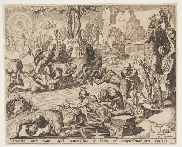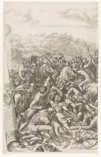 Editor: So, this print, "Overwinning van Wladislaus Wasa," dating from 1621 to 1660, attributed to Francesco Villamena, is quite a dynamic scene, an obvious landscape battle. It has the chaotic energy of the baroque, but how should we really *read* it? Curator: Given that it’s an engraving, I’d focus less on “reading” and more on considering the labor that went into its production and distribution. Think about the engraver as a skilled worker. How might the act of replicating an image through engraving influence its reception, particularly regarding historical events? Editor: Influence? In what way? Curator: Consider the materiality of printmaking. Engravings were relatively reproducible, disseminating images and narratives widely. Doesn't that mass reproduction have social and political ramifications for how victory or defeat were understood then and later? Editor: That's interesting, the social and political effects. How might that specifically play out here? The choice of paper, the ink... were these strategic? Curator: Definitely. These weren't individual artworks like paintings; these prints existed to circulate. The scale of production and audience interaction impacts the art itself. How many hands touched this work from its creation to its eventual arrival here? Who profited? Whose story does this engraving perpetuate? Editor: So, even the size and number of prints are vital to how the art affects viewers, far beyond subject matter? It’s about how accessible the victory became. Curator: Exactly! We're not just interpreting symbolism; we’re dissecting the material conditions of image-making, shedding light on the production, consumption, and social life surrounding the work. Editor: Wow, that's given me a whole new perspective to consider. Thank you for illuminating that! Curator: Of course! It's about viewing these works as cultural commodities, and how the mode of production informs their very meaning.