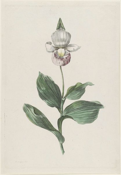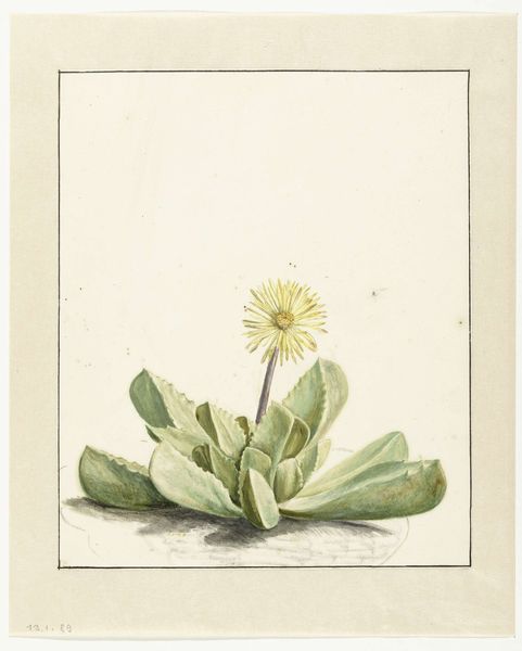 Curator: Oh, hello. Well, here we have a fascinating botanical study—"Haemanthus albiflos," or "Paintbrush," as it’s more colloquially known, captured with watercolor and drawing, potentially between 1777 and 1786 by Robert Jacob Gordon. Editor: You know, it feels almost dreamlike, despite its scientific purpose. There's something very soft and quiet about the way the colours blend; what's the material impression? Curator: He certainly captured the flower’s essence, didn't he? Observe the detailed rendering of the petals, the delicate stippling effect conveying the texture. Editor: Absolutely, there's such close attention given to those textures and the structure; the elongated stem leads right to the compact cluster of its nascent blooms, crowned by green bracts. It almost echoes certain architectural styles of that time. Is that weird? Curator: Not at all. You're picking up on the formal elements, which is insightful. Think about botanical illustration then—a collision of science and art. It wasn’t just about accuracy; it was about revealing the beauty hidden within nature. Editor: And its strangeness! I love how this peculiar beauty is on display in full measure; I imagine it as if he caught the flower at its most vulnerable, maybe shy to present itself to the world at large. Curator: Consider how Gordon was both a military man and explorer as well as a keen naturalist, so for him, I think, observing this flower could well have been part of his journey in the Cape of Good Hope. There is this kind of isolation that pervades. It is simple but sublime. Editor: Mmm, so the context shifts. The lone botanical study might then also stand for a solitary figure within the grandeur of its landscapes. It offers a fascinating interplay of scientific examination, artistic creation, and deep emotional depth, all within this lovely artwork. Curator: Precisely! And perhaps, even the briefest interaction we have just had allows us to have deepened our regard for what botanical artworks can give!