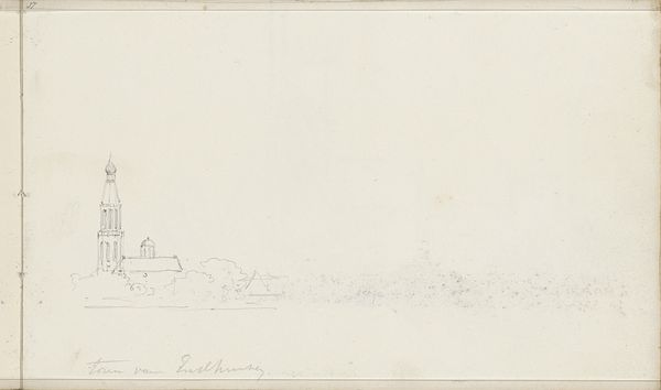 Editor: This is Petrus Johannes Schotel's "View of Enkhuizen with the Gelderse Tower," a pencil drawing on paper, dating from about 1841 to 1865. It’s incredibly minimal, almost ghostly. What do you see in this piece beyond just the simple rendering of a cityscape? Curator: This drawing, while seemingly simple, speaks volumes about Dutch identity and maritime power during a shifting historical period. Enkhuizen, once a vital port, was experiencing economic decline by the mid-19th century. Schotel, known for his marine paintings, captures the town's quiet dignity. Do you see how the starkness of the medium, just pencil on paper, mirrors that sense of fading glory? It avoids romanticizing the decline. Editor: Yes, now that you mention it, I do. I was focused on the aesthetic of it, rather than the potential historical commentary. So the choice of medium is significant in understanding the artist's intent? Curator: Precisely. And think about whose stories are *not* being told here. The drawing centres a very specific visual language for national identity that is often bound up with masculinity and the white middle classes. Consider the absences, the lives of the working class, of women, or those from marginalized communities within Enkhuizen that remain invisible in such a vision. What implications might that carry? Editor: I see. It raises a question of whose perspectives are validated through these depictions of national identity. I hadn't considered that silence as part of the story. Curator: Exactly! And questioning these silences is a crucial step in understanding not only the artwork but also its role in shaping and perpetuating specific narratives. Editor: That's given me a lot to consider about art's role in reinforcing particular views of history. Curator: It does so for me as well. It reminds us that art isn't neutral; it actively participates in constructing and negotiating power dynamics.