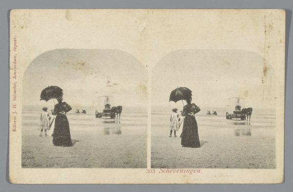 Hendrik Herman van den Berg made this photo, titled 'Two women with parasol on the beach', using photography. Imagine yourself in the late 19th century, a time when social norms dictated women's roles and appearances. Van den Berg’s photograph captures two women on a beach, parasols in hand, their clothing hinting at middle-class status. These parasols, symbols of protection from the sun, also represent the constraints placed on women, who were expected to maintain a certain image of purity and delicacy. The beach, often associated with freedom and leisure, becomes a stage where social expectations are performed. The women's attire, while fashionable, restricts their movement and embodies the era's ideals of femininity. Van den Berg's composition invites us to reflect on the complex interplay between freedom and constraint, identity, and representation. This image offers a glimpse into the lives of women navigating a society defined by rigid gender roles, capturing a moment of both leisure and subtle confinement.