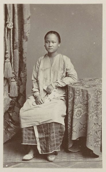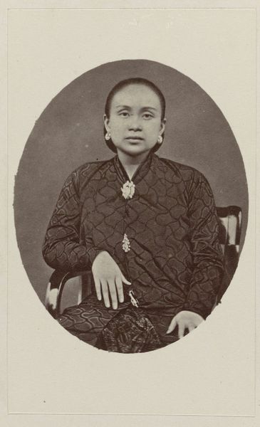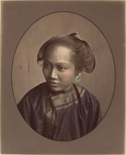 Raimund von Stillfried captured this photograph, "Fille de Shanghai," in the 19th century. The oval composition frames a young woman, whose direct gaze meets ours with a quiet intensity. The photograph’s muted palette emphasizes texture and form. Notice the intricate detail of her traditional dress, the delicate fabric suggesting a subtle yet tactile quality. The artist skillfully uses light to model her face, highlighting the smooth skin and structured features. A semiotic analysis would note how elements like her jade earrings and hair ornaments operate as visual signs of status and cultural identity. Consider how Stillfried uses the formal elements of photography to engage with broader issues of representation. The carefully constructed image invites us to consider the relationship between the photographer, the subject, and the viewer. It prompts us to question our own assumptions about cultural identity and representation in the colonial context.