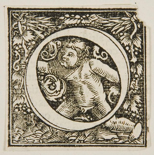 Editor: This small woodcut print, titled "Letter Q" is by an anonymous artist. It's so detailed! What kind of imagery or symbolism stands out to you? Curator: Notice how the letterform embraces a scene of youthful labor amidst flora. The child, burdened yet engaged, echoes classical depictions of putti, but here, linked to the everyday. What emotional associations does this evoke? Editor: It feels like innocence intertwined with responsibility. I hadn't considered the putti connection. Curator: Exactly. It's a dialogue between high art and common experience, a visual memory of cultural ideals filtered through the alphabet itself. Does that shift your understanding? Editor: It does! I see how these symbols connect across time and culture. Thanks!