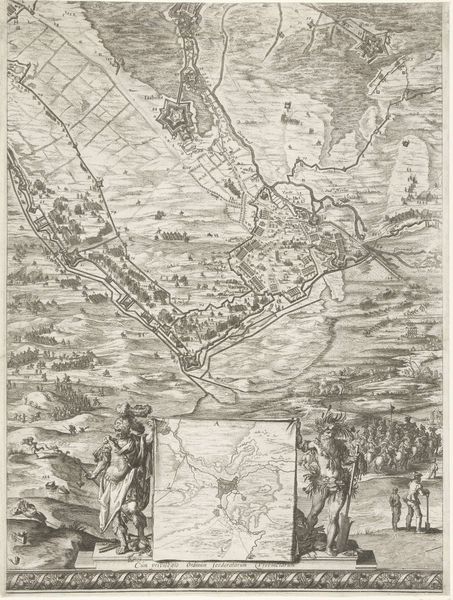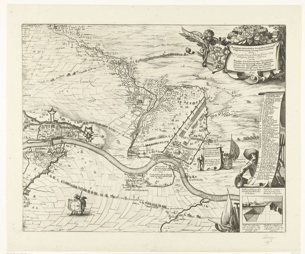 This etching titled ‘Slag bij Kassel’ was created in 1677 by an anonymous artist in the Netherlands. It shows the Battle of Kassel, a significant event during the Franco-Dutch War. This image employs visual codes and cultural references that would have been easily understood by its 17th-century audience. The detailed depiction of the battlefield, with its formations of troops and strategic placement of geographical features, speaks to the importance of military strategy and territorial control during this period. The allegorical figures in the foreground – including the bust of Louis XIV – suggest the broader political and cultural implications of the battle. The Dutch Republic, at this time, was a major economic and artistic power, but it was also deeply intertwined with the political struggles of Europe. By examining period maps, military reports, and political pamphlets, we can better understand the social conditions that shaped the production of this image. Such resources allow us to interpret the image not just as a historical record, but also as a reflection of the complex social and institutional forces at play in 17th-century Europe.