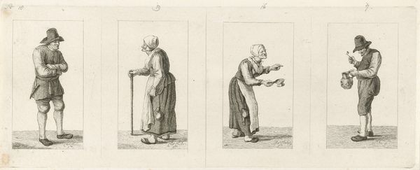 Editor: This is *Sketches of Five Figures* by Willem van de Velde the Elder at the Harvard Art Museums. The figures, rendered in brown ink, appear to be engaged in everyday activities. What strikes me is the anonymity of these figures. What do you see in this piece? Curator: These figures, though anonymous, evoke a powerful sense of the human condition. The woman carrying a child, the figure slumped against a wall—these are timeless symbols of labor, care, and perhaps even weariness. Notice how their postures convey emotional weight without distinct facial features. Editor: So you're saying the symbols, not the individual identities, carry the meaning? Curator: Precisely. Van de Velde captures archetypes, tapping into our collective memory of these roles. Each figure, framed by shadow, embodies a universal experience. It's a reminder that art can speak volumes without specific narratives. Editor: That really changes how I see this sketch. It's not just a study, but a reflection on shared human experience. Curator: Indeed. And the beauty lies in how these symbols continue to resonate across time and cultures.