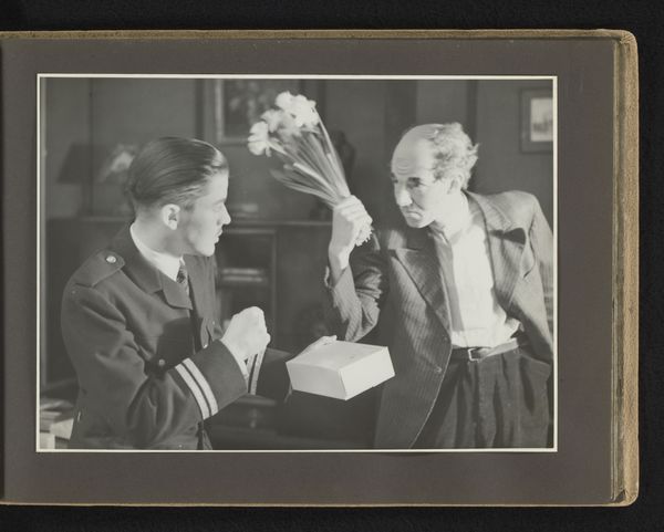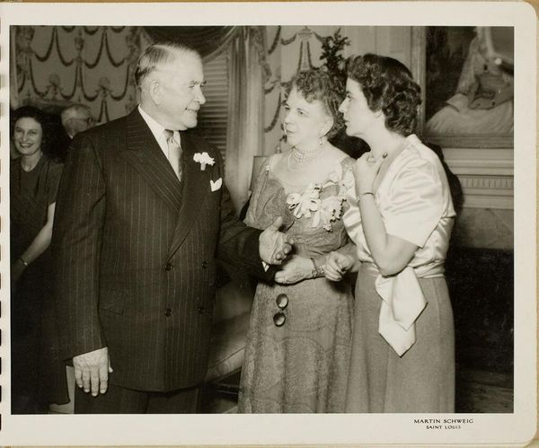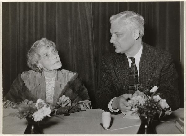 Editor: Here we have Martin Schweig's "Untitled (two women talking)" from the Harvard Art Museums. It feels like a scene frozen in time, perhaps a candid moment at a social gathering. What symbolic weight do you see in this image? Curator: The pearls, the gloves, the floral corsage: aren't these all potent signifiers of class and social ritual? They speak of a bygone era, a shared cultural memory of formality. Notice the stark contrast between the women's attire. What might that signify? Editor: Perhaps a generational difference? One woman is adorned, the other more austere and modern. Curator: Exactly. The photograph, itself, becomes a vessel, capturing fleeting expressions that hint at unspoken narratives. These visual cues create an emotional resonance, don't they? Editor: Absolutely, it makes you wonder about the nature of their conversation. Curator: Indeed. It's a study in symbolic language and the stories we tell through our appearances. Editor: I hadn't considered how much their clothing and accessories communicate. Curator: And how those symbols create a lasting impression, shaping how we remember and interpret the past.