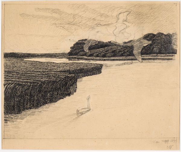 Editor: So, this etching, "Aften ved Strandmøllebugten," or "Evening at Strandmølle Bay," created in 1914 by John Lübertschitz, it's very tranquil. It feels almost… untouched, like a scene from a time capsule. What’s your take on it? Curator: This print offers a fascinating lens through which to examine the cultural perception of the Danish landscape in the early 20th century. How do you think it speaks to ideas of national identity or belonging during that period, particularly considering the rise of national romanticism in art? Editor: I hadn’t really considered that. Maybe the serene depiction implies a stable, enduring nation, in contrast to the turbulence brewing in Europe at the time? The Impressionistic style definitely romanticizes the natural scenery. Curator: Exactly. Lübertschitz uses a technique emphasizing light and atmosphere. Now, considering the print medium itself – etching – how does its accessibility potentially impact the dissemination and public reception of this idealized landscape imagery? Editor: Because it’s a print, multiple copies can exist, right? That makes it available to a broader audience, potentially reinforcing those nationalistic ideals on a wider scale. Unlike a unique painting only viewed by a privileged few. Curator: Precisely! The power of the reproducible image lies in its democratic potential and the possibilities for shaping collective memory. Were such landscapes intended for purely aesthetic enjoyment or did they play a part in defining Danish identity? Editor: Thinking about it that way really makes me consider the artist's intention and how the social context might influence viewers. Curator: Indeed. The art world constantly adapts to historical factors. What did you find the most interesting part of this? Editor: Considering landscape art as a kind of soft power, or gentle propaganda, it gives me so much more appreciation of its reach and social importance! Curator: That's great to hear. Reflecting on this beautiful work with you really made me think about the powerful interplay of artistic intention, socio-political context, and medium in shaping national identity.