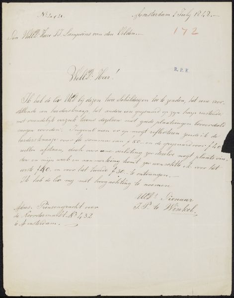 This is a letter to Jonkheer H.P.F. Hooft, secretary of the committee of the Exhibition of Living Masters in The Hague, written by Lodewijk Anthony Vintcent in 1841. Such exhibitions reveal the institutional structures of art in the Netherlands at this time. Vintcent writes in elegant Dutch, requesting the return of paintings submitted for consideration. This letter provides a window into the formal processes of art being reviewed and displayed in the Netherlands, a country shaped by its powerful merchant class. Committees of experts decided what was art, and therefore what had value. The letter allows us to see the mechanics behind art production and exhibition, and gives us a sense of the social networks in which artists operated. To understand it fully, we can research exhibition catalogues from the period, letters between artists and patrons, and committee records. These reveal the meaning of art as contingent on its social and institutional context.