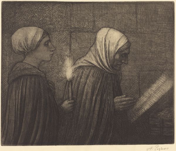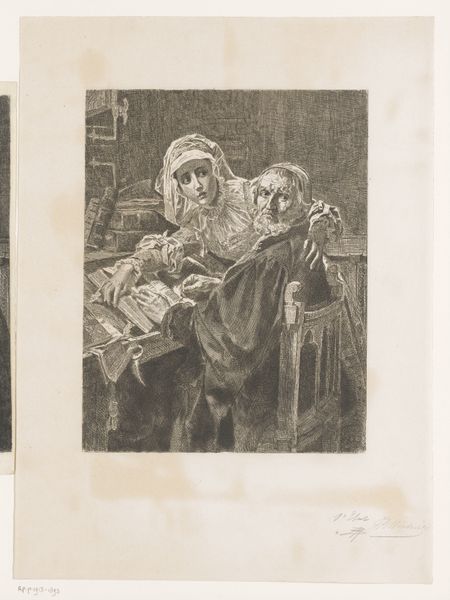 Editor: This drawing, “Rabbi Elischa” by Alphonse Levy, made in 1897 with pencil, has a somber mood. Two men are engrossed in a book. What do you see in this piece beyond the initial impression? Curator: It’s interesting to consider this work in the context of late 19th-century Europe. How were Jewish identities being represented and consumed? Does this drawing participate in or challenge existing stereotypes? Notice how the artist uses light and shadow – does it create a sense of reverence, or perhaps something else? Editor: That's a great point. I hadn't thought about the role of stereotypes in art during that period. The shading is so detailed. The light makes them appear to be absorbed in something spiritual. What's the significance of the book? Curator: The book is, of course, central. But consider, what are they reading, and within what community or context would this reading take place? Think about literacy, access to texts, and the preservation of knowledge within marginalized communities. The act of reading itself can be an act of resistance. Editor: So, the simple act of reading can carry a larger weight when considering social factors and the identities of the subjects? Curator: Precisely. And how might their dress, beards, and the interior setting play into this representation? L\u00e9vy, although himself Jewish, was working within a visual culture often hostile to Jewish people. So how does this image function as representation? Does it subvert or support popular prejudices? Editor: I didn't think to look at it that way. I guess art isn't just about what's on the surface, but what it communicates about society, power and identity. Thank you. Curator: Exactly! Art is a visual dialogue, and asking the difficult questions is key.