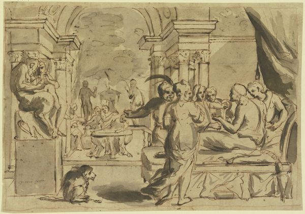 Editor: This artwork, an ink drawing titled "Christ Washing the Feet of the Disciples," dates back to somewhere between 1600 and 1700. The architectural setting and flowing lines create a very formal, stage-like composition, don't you think? What strikes you most about its cultural relevance? Curator: Well, the Baroque period was all about drama and heightened emotion. Think about the Reformation's impact: images became tools of persuasion. How does this humble drawing participate in that grand tradition of religious instruction, would you say? Editor: It’s definitely portraying a strong narrative, showing humility in a hierarchical society. It makes you think about social structure... Curator: Exactly! Art served a very public role, conveying messages not just about faith, but about power, obedience, and the proper order of things. This scene, Christ humbling himself, what does that tell us about how artists and institutions were negotiating social dynamics during the period? Editor: It suggests maybe a push and pull. There's the divine right of kings, but also an emphasis on religious figures serving others? Curator: Precisely. Notice how the architecture frames the figures. Who’s included in this space and who seems excluded or peripheral? That kind of visual language speaks volumes about who art was *for* and whose stories it told. Editor: So the drawing isn’t just about religion; it’s a historical record of power structures and artistic choices in the Baroque era? Curator: Precisely! Reflecting on that now, it helps understand art as both reflection of and influence on its social and political environment. Editor: I'll definitely keep that in mind next time I’m looking at Baroque art! Thanks for sharing your insights!