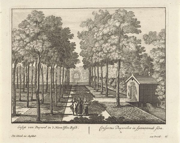 Curator: Let’s explore this print titled "April, met een gezelschap in een tuin" from 1614, now residing at the Rijksmuseum. Hendrick Hondius I created this piece using etching. What strikes you initially about it? Editor: It's an incredibly organized image, almost to the point of being unsettling. The rigid geometry of the garden contrasts sharply with the natural setting beyond. I am curious to learn more about the technique and composition. Curator: Consider the imagery associated with gardens at the time. The geometric order mirrors a desire for control, reflecting humanist ideals of reason dominating nature. Even in the "April" allegory—traditionally representing renewal and growth—we see imposed structure. Editor: True. The sharp lines defining each garden bed are emphasized by the high contrast of the etching. See how the perspective almost forces the viewer to acknowledge that man-made order first, rather than allowing a softer gaze towards nature? The artist is highlighting a relationship by means of compositional hierarchy. Curator: That focus on geometric structure signifies much more than surface aesthetic, and that formal language is important, sure. But I find it deeply embedded in Renaissance ideals. The very act of depicting a garden this way symbolizes civilization asserting its dominance. Even the figures within are carefully placed to maintain this illusion of control and order. Consider also the cultural and political power invested in elaborate gardens during the era. Editor: So the layout and details reflect ideas about society's hierarchy and power. It's a carefully designed landscape. Beyond that I also wonder about its influence. The rigid linear designs became quite prevalent later, and can be read formally in all the works produced afterwards. Curator: A key symbol then, I'd argue, of a shifting cultural mindset, capturing ideals and power relations that reverberate even now. Editor: Yes, precisely. Thinking about this work I am compelled by the precision and intentionality in conveying order and control—a fascinating display of geometric harmony versus the seemingly limitless possibilities suggested by the trees and the distant landscape.