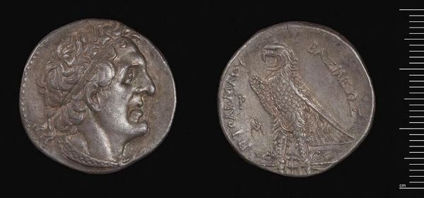 Curator: Here we have a silver tetradrachm, essentially a coin, minted by Antiochos IX Kyzikenos. It weighs just over 16 grams. Editor: It's like holding history in your hand, isn't it? The wear and tear on the metal whisper stories of trade, power, and everyday transactions. Curator: Precisely! On one side, we see the king's portrait, while the other features a depiction of a Greek deity. A declaration of both earthly and divine authority. Editor: The figure of the king in profile, it’s a very gendered, patriarchal image. It makes me wonder about the role of women in Kyzikenos' Syria. Were they completely excluded from this kind of symbolic representation? Curator: That's a crucial question. While coinage predominantly features male rulers, examining other artifacts from the period might reveal more nuanced perspectives on gender roles. Editor: It makes you consider what survives and who gets to decide what is worth preserving and remembering. Curator: Absolutely. And how we interpret those fragments dictates our understanding of the past. Editor: It reminds us that even the smallest object can hold vast sociopolitical narratives. Curator: Right, and this coin, tiny as it is, still holds immense power.