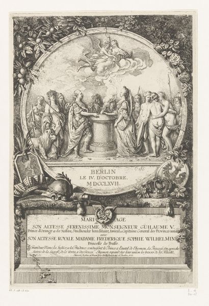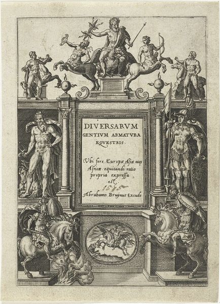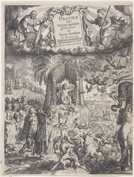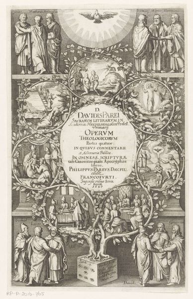 Editor: This is a print by Cornelis Galle I, created in 1627, currently held at the Rijksmuseum. The full title is quite a mouthful: *God tronend, uitstorting van de Heilige Geest, bevrijding van Paulus en apostelen*. It has a really elaborate, almost overwhelming composition. How do you even begin to approach a piece so dense with detail? Curator: Let us consider its structure. We see a clear hierarchy established through the composition. God is enthroned at the top, bathed in light, literally and figuratively the high point, then arranged symmetrically down from there. What effect does this compositional choice have? Editor: It definitely emphasizes God's power and centrality. Everything visually flows down from that point. The symmetry provides a sense of order amidst the chaos of figures and action. Do you think the rigid structure could also be limiting? Curator: Limiting perhaps for expressive potential in a different context, but consider its function. It's a title page for a commentary on the Acts of the Apostles. Therefore, clarity and order are paramount. Semiotically, we can read the ascending arrangement as a visual representation of spiritual elevation. Do you notice any specific artistic decisions when looking at the treatment of light and shadow? Editor: Yes, the engraving creates distinct areas of light and dark. Figures seem to emerge from the shadows, drawing attention to specific gestures and expressions. It’s interesting how Galle used this technique to create drama within such a tightly controlled composition. Curator: Precisely. Galle manipulates light to guide the viewer's eye and emphasize the spiritual narrative. Editor: So, by analyzing the composition and technique, we can understand how Galle visually communicates religious themes in a structured way. Curator: Indeed. The artist’s formal choices become the vocabulary through which the story unfolds. Looking closely, one can gain profound insights.