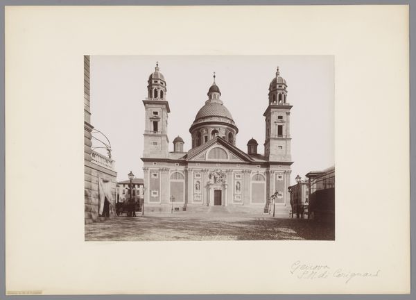 Editor: Edmond Bacot's "Poissonerie, Caen," dating back to sometime between 1852 and 1854, captures a market scene using albumen print. The tones are wonderfully muted, giving it such an atmospheric quality. It feels so still, like a scene from a dream. How would you describe your first impressions? Curator: Stillness, definitely. And light. Notice how the spire just kisses the clouds... There's almost a medieval quality here, the rigid structures meeting soft sunlight. I wonder about Bacot's intent... was he just documenting, or trying to freeze a feeling, an essence of Caen itself? What feelings come to mind for you, gazing at those stoic buildings? Editor: That stillness really emphasizes the architecture. It also strikes me as surprisingly modern in some ways, with those strong horizontal lines of the fish market contrasting against the vertical spire. Curator: Precisely! That contrast... think of it as a visual dialogue between progress and tradition. A tension Bacot maybe didn't consciously stage, yet captured so vividly! Is that perhaps where that dreamy quality originates? A kind of soft-focus paradox? Editor: Maybe! And that tension gives the image a timeless quality too. What I initially thought was simple documentation feels like a conversation, a complex dance between different elements of the city. Curator: That’s photography at its best, isn't it? Revealing layers beneath the surface, inviting our imaginations to wander and find echoes of ourselves within a moment frozen in time. Bacot... he gives us more than just a picture. He gives us a feeling.