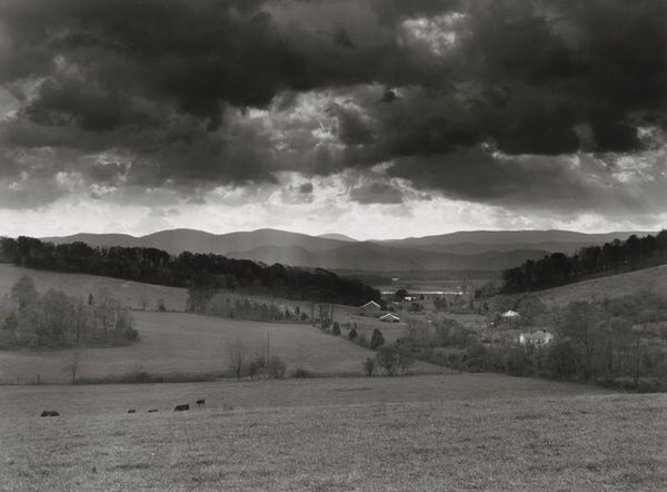 Editor: This is Alfred Stieglitz's "House and Poplars, Lake George," a gelatin-silver print from 1933. It's a strikingly composed landscape. What strikes me is the looming height of the poplar trees against the more humble, grounded house. What symbolic language do you see at play in this piece? Curator: An interesting observation about the contrasting heights. Consider the poplar itself, a tree that reaches for the heavens. Throughout history, it’s often represented aspiration, growth, and even resurrection in some cultures, connecting earth to sky. How might Stieglitz be playing with that expectation? Editor: I hadn't considered that specific symbolism. Maybe the house represents the grounded reality, and the poplars are this… yearing for something beyond? Curator: Precisely. And note the road leading into the composition, almost inviting the viewer on a journey. Roads and pathways in art frequently symbolize life's journey, choices, and destinations, both literal and metaphorical. Does the monochrome enhance the effect? Editor: It does seem to amplify that dreamlike quality, or almost… like a memory? Removing the color simplifies it, and pushes me to focus on composition and shape. Curator: Color, in this context, could dilute the symbolic essence. By presenting us with a stark monochrome, Stieglitz steers us toward those deeper meanings – the play of light and shadow becomes paramount, suggesting both hope and melancholy. Do you think that sense of longing is effective? Editor: Definitely. I'm now noticing even the wisps of bare branches at the very top of the central poplar—it heightens the feeling of vulnerability despite the tree’s height, and amplifies the depth of meaning. It seems to summarize a yearning for growth with the understanding that there will be loss and challenges along the way. Curator: An excellent point! These details echo themes found throughout Stieglitz's oeuvre – his fascination with nature, and the way it mirrored the inner life. Thinking about this photograph now, I wonder what other secrets are hidden within these deceptively simple landscapes. Editor: This has been incredibly insightful. It's fascinating how much can be unearthed through careful observation of symbols.