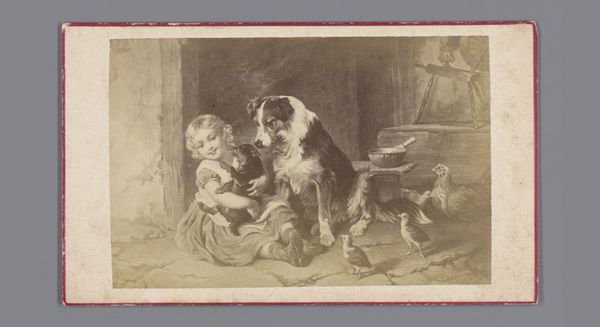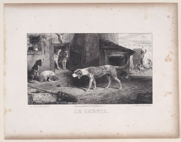 Editor: We’re looking at "Ten Dogs in and Around a Doghouse," an etching dating from around 1821-1886 by Dirk Jurriaan Sluyter. It's a remarkably detailed scene of canine domesticity, but the stark contrasts make it feel rather serious, don't you think? What elements of the composition strike you most powerfully? Curator: Certainly, the chiaroscuro is quite pronounced. Note how Sluyter uses varying densities of lines to create depth and shadow. The composition guides the eye: from the dark dog on the left, up to the brighter central dog, then towards the doghouse and finally, the shadowy top left corner. This deliberate arrangement seems less concerned with sentimentality and more interested in exploring tonal relationships and textures. Editor: I see what you mean about the arrangement of light guiding your eye. It almost creates a diagonal pull across the picture plane. Is there a deeper philosophical or semiotic point here beyond the obvious subject matter? Curator: Consider how the varying textures contribute to the overall reading. We see coarse lines for the hay, softer lines for the fur, and carefully placed hatching to suggest the form of the doghouse. Sluyter directs our attention not through narrative, but through an appreciation of purely formal concerns – line, tone, texture, and their interplay within the bounded space of the print. Are we not prompted to focus on the artistry and form, above all else? Editor: That's a perspective I hadn't considered. I was so focused on trying to infer a story or some implied narrative among all the dogs. But thinking about the form first really changes things. Curator: Indeed. By prioritizing the visual language itself, Sluyter compels us to consider art as an autonomous system, a world of forms that creates its own internal logic and meaning. Editor: This focus on the internal visual world, almost detached from storytelling, is a great insight! Curator: A useful reminder to perceive beyond subject matter, and towards appreciating art's intrinsic language.