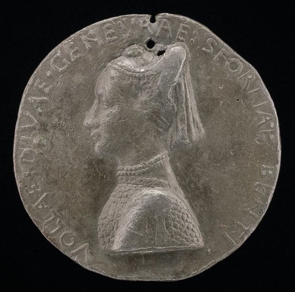 Editor: So, this is "Ursula Saemftl, Second Wife of Sebastian Liegsalz," a bronze relief created by Friedrich Hagenauer in 1527. It's interesting, almost like a coin, but on a grander scale. How do we unpack the layers of history embedded in such a portrait? Curator: The fascinating aspect lies in considering the commissioning context. Who seeks to memorialize their spouse in metal? And what does this gesture say about societal structures? We see a portrait of Ursula Saemftl enshrined in bronze – not merely an image, but a tangible assertion of status. Consider the choice of bronze itself; its association with permanence lends significant weight to the depicted subject. What does it suggest about Ursula’s place in society, or at least, her husband's aspirations for her perceived place? Editor: I suppose it suggests she was someone important, or that her husband wished her to be perceived that way? The detail in her dress and hairstyle must also be communicating something specific about her status and role. Curator: Precisely. Let's consider what aspects are *not* there. This isn't an intimate scene; it's a carefully constructed public image. It's propaganda in the most basic sense—a deliberate effort to shape how Ursula is seen and remembered, by controlling the visual narrative. The choice of a profile view lends formality; how do you think that differs from, say, a full-face depiction? Editor: It's almost like a Roman emperor! More official and distant, definitely less intimate than a head-on portrait. This gives us clues on how the artwork participates in the historical narrative of nobility and gender, right? Curator: Exactly. These medals functioned within a sophisticated system of social messaging. What seems a simple portrait reveals complex motivations concerning family status, legacy, and the carefully crafted presentation of self within a highly structured society. Editor: I never thought about portraiture as a form of early "branding" before. I’ll definitely look at these kinds of works differently from now on.