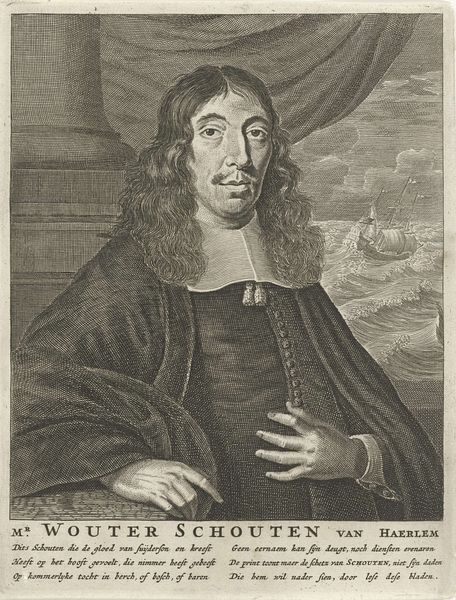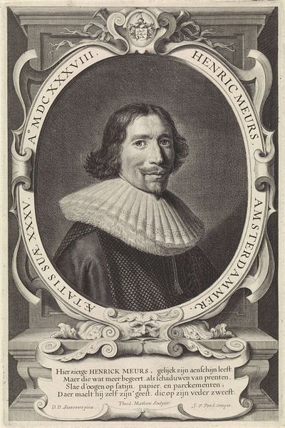 This is Alexander Voet the First’s "Portret van Eugene de Vicq,” an engraving measuring 202 by 145 mm. The composition of the print relies on a series of interlocking shapes and lines to convey both realism and symbolic meaning. The oval frame encloses the figure and text that creates a sense of containment, contrasting with the subject's hand extending into our space. Voet’s use of line, particularly in the rendering of the face and clothing, demonstrates a mastery of chiaroscuro, giving depth to the subject. The placement of the coat of arms and laurel branches, and the text around the frame, functions as a semiotic system which would be recognised by Voet's contemporaries as a signifier of the sitter's identity and status. It is a study in contrasts between individual identity and social structure. Consider the function of the engraving itself, a form of reproduction, a symbol of knowledge, and how it circulates ideas. The print invites questions about representation, identity and the structural frameworks within which these concepts are understood.