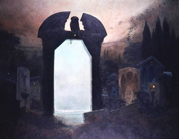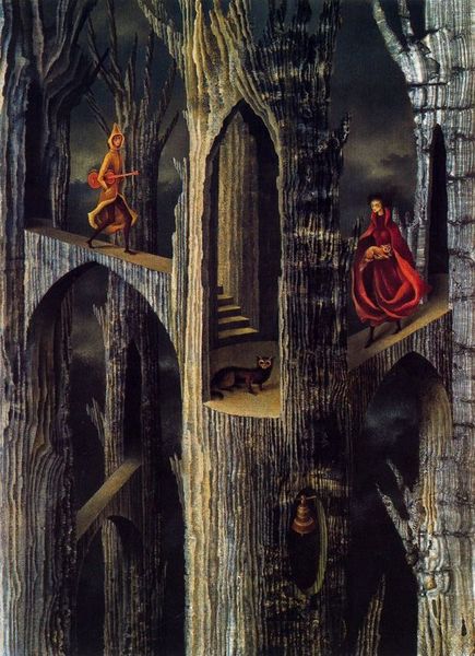 Curator: Let's discuss this untitled tempera painting by Albin Brunovsky. The artist seems to employ elements of both Romanticism and fairy-painting styles, a truly intriguing combination. What are your initial impressions? Editor: A somewhat somber, fairy-tale-like quality certainly emanates. The elongated perspective and looming architectural form almost create a sense of impending doom. There is some contrast between the glowing structure on the left, and the colder tones dominating most of the picture. Curator: Note the calculated composition, with the river cutting through and acting as a dominant visual vector. Also observe the strategic employment of blues and golds to build volume through contrast, directing the viewer's gaze into the space of the piece. What are your thoughts about Brunovsky's symbol usage, from an iconographic viewpoint? Editor: Water is often emblematic of the subconscious or of powerful life transitions. I can see a figure in the ship near the center... sailing along the water. The presence of such symbols suggests an introspective psychological journey and transition into another world. Curator: Introspective is spot on, particularly when considering Brunovsky's other artworks with a strong narrative. In this context, water gains another possible symbolism. Let's return to the picture's materiality: I think Brunovsky deliberately used the tempera's properties to reach this effect: matte surface and subtle layering of tones to give the forms a palpable but strange depth. The technique also enhances the somewhat dreamy atmosphere. Editor: A journey into an enchanted unknown space. Considering that perspective, it almost feels like plummeting down an endless chasm. Overall, I can't deny its power, despite its darker mood. It sticks in one's memory long after viewing. Curator: I fully agree. Brunovsky expertly blends these techniques into a remarkably unique artwork, leaving us with this subtly unnerving feeling and lingering questions. Editor: An unnerving and beautiful glimpse into another plane, one where symbols echo and stories are just beginning.