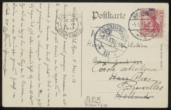 Curator: Looking at this fascinating piece titled "Prentbriefkaart aan August Allebé" by Johan Melchior van der Mey, what's your initial take? It appears to be some sort of postcard crafted perhaps between 1908 and 1930. Editor: It feels deeply personal. The handwriting, rendered in pen and ink on paper, with the stylistic touch of calligraphy, brings a sense of intimacy. I see the stamp, the address... it speaks of a tangible connection. A little relic from a time before our hyper-digital means of communication. Curator: Indeed. Van der Mey, known for his Amsterdam School architecture, often used graphic elements in his designs. Do you think this card might relate to the artistic networks of the early 20th century? Editor: Almost certainly. Postcards were incredibly important for circulating images and ideas amongst artists and intellectuals. I'm curious about the symbolism of the imagery described in the written part. Is it describing the emotional state of the artist in Florence, Italy? How are we supposed to understand the context here? Curator: Possibly so. Van der Mey has written text referencing a visit and speaking of experiences within the visuality of Renaissance and ancient culture and I'd expect this to be culturally charged for him. Consider this postcard less as purely informative and more as a form of social currency, something that cements an intellectual bond. These small forms of inscription carry the emotional impact that links individual psychology and art history into an emblem for their era, where the personal touch stands as an art object itself. Editor: You are so right; even mundane objects were capable of so much expressivity at that time. Thank you for pointing this out. It makes me realize the value of slowing down and considering what such ephemera tells us about how people were creating connections in the pre-digital world. Curator: A potent reminder, certainly. I hope our listeners found this insightful too. It reveals the surprising ways human expression manifested at this pivotal moment in modernity.