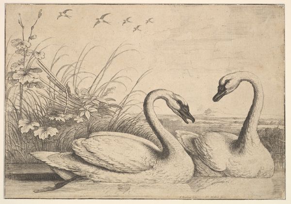 Editor: This is Francis Barlow's "Swans," a beautiful drawing held at the Tate. The swans themselves are so elegantly rendered, but the whole scene has a rather serene quality. What strikes you most about this image? Curator: The swan, throughout history, has been a potent symbol. Think of Leda and the Swan, for instance. Barlow, though, offers a domestic tranquility. The birds behind might suggest freedom and perhaps a connection to something beyond the immediate. What kind of story does this drawing seem to tell you? Editor: It feels like a simple observation, elevated by the grace of the swans themselves, but that symbolic tension adds complexity. Curator: Indeed. It reminds us that even the most familiar images carry layers of meaning, shaped by culture and personal experience.