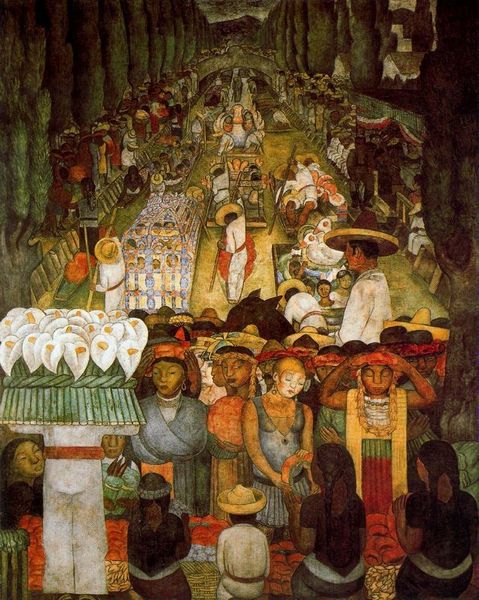 Editor: Here we have Diego Rivera's "The History of Mexico," painted in 1935. It's an oil-paint mural dominating the Palacio Nacional in Mexico City. The sheer density of figures is overwhelming; I’m struck by its chaotic energy. What do you make of such a complex historical panorama? Curator: Complex is the perfect word! It's as if Rivera crammed centuries into a single frame, wouldn't you say? Forget delicately unfurling a narrative, he opts for this... well, a vibrant visual cacophony! Look at the way indigenous figures clash with colonizers, emperors loom above revolutionaries. How do you think he’s using these visual juxtapositions to talk about Mexico's identity? Editor: It feels like he's collapsing time, showing how the past is always present. The fire, the soldiers… it suggests an ongoing struggle. A revolution still being fought, perhaps? Curator: Precisely! There’s such a feeling that history is not just something on the books. And look at the inclusion of himself in it! The self-insertion. History then becomes an active, conscious force. A messy one at that, ha! Editor: So, it's not just a depiction of history, but a personal commentary on its enduring impact. That is super insightful, I had never even considered this idea of history being 'messy'! Curator: Indeed, it is messy. This piece shows that to truly understand a place, you need to get tangled in its stories, its passions, and its contradictions, don't you think? It reminds me of trying to assemble a puzzle blindfolded—frustrating, maybe, but incredibly revealing.