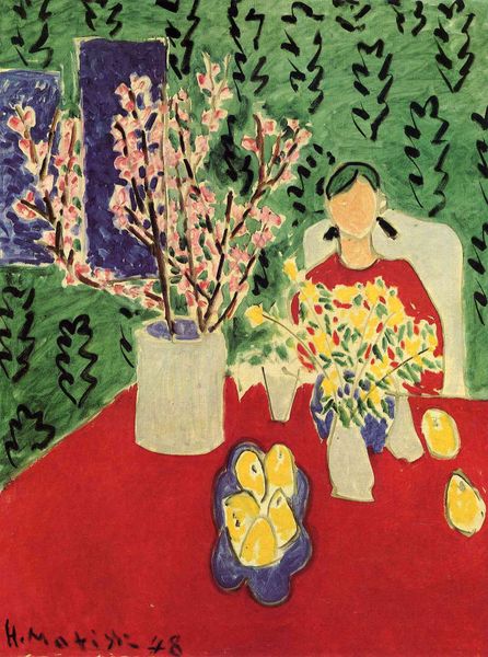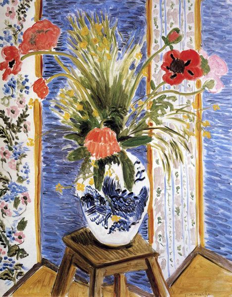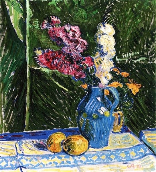Editor: So, here we have Matisse’s "Calla Lilies, Irises and Mimosas," painted in 1913, rendered in oil with an impasto technique. The bright colours immediately struck me – that saturated blue patterned tablecloth, the splash of yellow…it's all very cheerful. How do you see it? Curator: I see a window into Matisse’s engagement with production itself. Note the flattened perspective and bold, almost crude application of paint. It challenges the bourgeois expectations of high art, drawing attention to the labor and materiality involved in its creation. It feels less like an attempt to represent reality and more like a constructed object. Editor: Constructed object, that’s interesting. So you see his artistic process as part of the message? Curator: Precisely. Consider also how this ‘naive art’ disrupts traditional artistic hierarchies. By embracing a style that mimics untrained artistry, Matisse questions the elitist values that define ‘good’ art. He's exposing the very foundations of aesthetic judgment, don’t you think? Editor: I suppose that makes sense. The painting’s surface and raw brushwork almost feels like a challenge to established tastes, maybe democratizing the whole notion of art. Curator: Exactly. And what does it say about the act of viewing itself, when presented with such unapologetic artificiality? How might the very wealthy art collectors for whom Matisse painted, engage with, and even consume, this portrayal? Editor: That’s a point. So rather than just pretty flowers, we're seeing a commentary on the art world and the consumption of art itself? Curator: Absolutely. It invites us to reflect on art's role within a capitalist framework. We can interpret this painting as challenging established norms of artistic skill and capitalist culture by calling our attention to how a cultural elite and it's industries create an art canon. Editor: I never considered that perspective before; it really changes how I see Matisse. Curator: Indeed. By thinking about its social context, the process and labour of its construction, “Calla Lillies, Irises and Mimosas” become so much more than a still life of flowers.