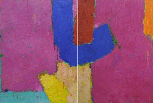 Curator: Immediately, the texture grabs me. You can practically feel the ridges and layers of the acrylic paint. Editor: I find that the choice of acrylic here signals a distinct shift in the artistic landscape, a move away from traditional oil paints, allowing artists to embrace faster drying times and build up textures in innovative ways. Shall we dive into this bold piece? This is John Hoyland’s "North Sound" from 1979, currently housed here at the Tate Britain. Curator: My first impression is this controlled chaos. Geometric blocks fighting to hold their own on the canvas, yet bathed in that overall ethereal blue. Editor: Interesting take! Considering its position within Hoyland's career, it represents a fascinating exploration of form and color relationships after his move into abstraction. He wasn't afraid to move away from figuration and really focus on materiality, something acrylic lent itself to. How the art world and institutions perceived it really validated abstract art on a grand scale, especially British abstraction. Curator: I am drawn to his manipulation of acrylic here. Note how some areas appear almost sanded down while others maintain thick impasto surfaces. The rough edges and varied surfaces contribute to the expressive power. Editor: I agree. His labor is very present here! Each swipe of paint embodies a physical engagement with his medium. And, of course, the use of colour. The intense hues layered atop one another creates this vibrant interplay. Red against green, the blue foundation fighting to break through. He plays a dangerous game, almost chaotic. Curator: Precisely! He doesn't smooth away the process; he emphasizes it, which becomes integral to its visual language. And consider the reception! In the 70s the dominance of abstract expressionism prompted important critical debates about intention, gesture and of course value. "North Sound," surely fueled some of that discourse, especially in England's institutional embrace of abstract works. Editor: Well, Hoyland certainly contributed to changing perspectives on abstract painting's capabilities, especially in pushing the material possibilities within painting practice. I’m particularly compelled to think about the role materiality had on viewers as a testament to what we value and the relationship we have with art-making as a kind of labor. Curator: Indeed! Hoyland's ability to provoke intellectual exchange highlights its cultural significance, leaving us contemplating both its physical creation and place in British visual culture.