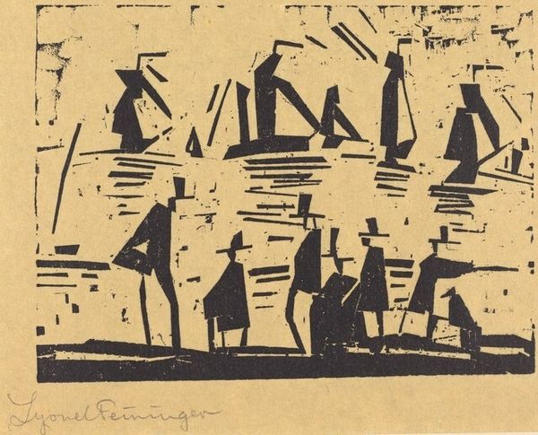 Lyonel Feininger made this woodcut, “On the Quai” with ink on paper, and what grabs me is the solid black shapes against the yellow of the paper. It’s a dance between positive and negative, where the cut of the block defines not just form, but light itself. Look at the ships, reduced to their geometric essence, yet undeniably ships. The artist's hand is visible in the confident cuts, each line a decision. See how the hatching suggests depth in the water, a vibration that contrasts with the solid forms of the boats. The way the figures are simplified, almost abstracted, speaks to a universal human presence by the sea. Feininger’s background in architectural drawing is visible here, you know, the way he fractures space into these crystalline shards. This reminds me a little of the work of the cubists, who also explored how to see multiple angles at the same time. Like them, Feininger invites us to look, and then look again. What do you see?