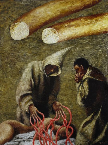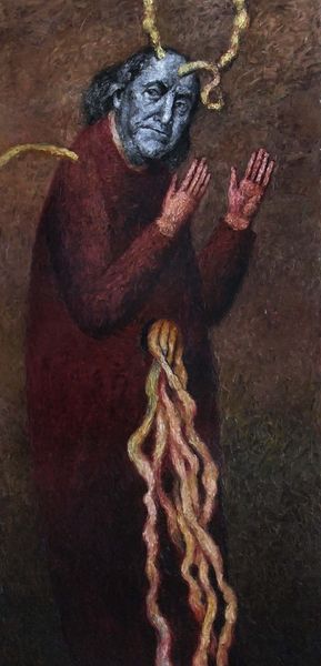 Alexander Roitburd painted The Tribute Money using oils in a way that feels both classical and totally now. I’m drawn to the surface, the way the paint is built up in layers, especially in the draped fabric. You can almost feel the weight of it, a heavy cloak rendered in creamy whites and browns. Then, there’s this shock of bright, almost cartoonish red cords looping all around the figure. They feel so modern, so graphic against the traditional rendering of the figure and the darkness of the background. It’s like he's challenging our sense of depth, pushing and pulling us between different ways of seeing. That dark background— it’s not just space, but a mood, a kind of contemplation. It reminds me of Caravaggio, that dramatic use of light and shadow, but Roitburd twists it, throws in these unexpected elements that make you question everything. It’s a conversation, a back-and-forth between art history and something entirely new.
