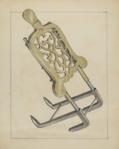 Curator: Here we have Gerald Transpota’s "Saddle," estimated to be from around 1937. It's rendered with watercolour, oil paint, and coloured pencil, an intriguing combination. Editor: It's so detailed. I’m immediately struck by the realism of it. The artist really captures the light and shadows, giving it a three-dimensional quality, although the floral embossing gives me pause. Curator: The attention to detail is really noteworthy, and the use of coloured pencil and watercolor over an initial painting is typical of much realist work from the period, focusing on aspects of everyday life while perhaps softening what could be a mundane object. In some ways it reflects a larger social narrative, in what elements from ranching culture were romanticized at this time. Editor: You are absolutely correct; it makes you consider that, doesn't it? What sort of person did this saddle belong to? Why memorialize it, if not to imbue some meaning upon the rider? Were they celebrating a person? Or did the artwork seek to immortalize something larger, an identity or type? There's definitely an element of nostalgia here. Curator: Considering the date, it is possible that this work may have even been part of an assignment. Transpota was an art instructor at multiple prominent midwestern universities, so we must acknowledge how it was created and what role this might have had within Transpota's career as an educator. Editor: True! I see the layers now. It’s not just a saddle. It represents layers of identity, labour, maybe even freedom. The artist could be highlighting how work, even that considered somewhat 'genteel,' can nonetheless contribute to a complicated and interesting historical narrative. Curator: It’s amazing how an item, divorced from its original function through its depiction in art, can elicit so many compelling social and historical questions. Editor: Indeed, and those are precisely the sort of issues we need to wrestle with and that the arts can promote.
