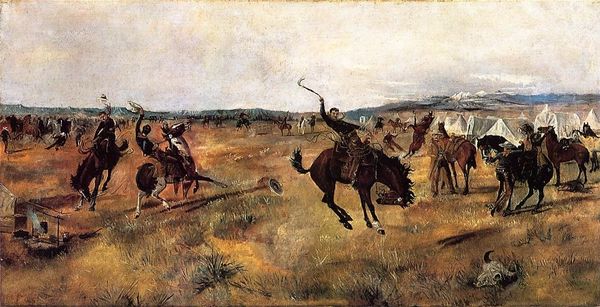 Editor: Right now, we're looking at "Mounted Shepherd and Cows," a painting by Giovanni Fattori from 1880. Painted with oil on canvas, it really evokes a somber mood for me with all these earthy browns and muted grays. What's your take? Curator: It makes me think of memories, and half-forgotten tales whispered at twilight, doesn't it? There's a distinct lack of sentimentality for rural life; Fattori doesn't gloss over the harsh realities, does he? I wonder if it's deliberate or simply a reflection of the times. Editor: Perhaps it’s a bit of both? Is it also because he adopted "plein-air" as painting approach? It may mean the subjects are portrayed more 'realistically', almost documenting a certain lifestyle. Curator: Exactly! Seeing that shepherd atop his horse reminds me of ancient statues. Do you feel that stoic sensibility as well, somehow coexisting with that very loose, painterly approach to realism? There's something almost… cinematic in that juxtaposition, wouldn’t you agree? Editor: Yeah, definitely cinematic. Like a still from some Western film. It makes me consider the way people actually lived, without the romanticized veneer. Curator: And it is so intimate at the same time. As though he and you are right there, observing life in those moments in time. He's not just showing us; he's inviting us in, with every visible brushstroke a story waiting to unfold, layer by layer. Editor: So much more to see than I originally thought. This was very helpful, thanks! Curator: My pleasure. Now, about those stories embedded in brushstrokes... imagine if paintings could talk…